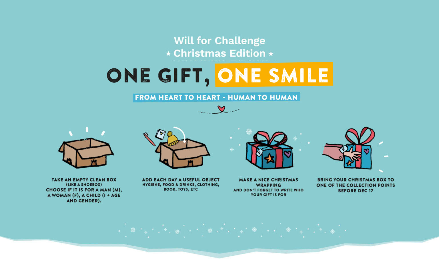ONE GIFT, ONE SMILE is a beautiful inclusive, human and meaningul project aiming at sharing Christmas love with people in need. From Dec 1 to 17, you fill a card box each day with a useful object (clothes, non-perishable food/drinkgs, hygiene products, toys, etc.), wrap your box with nice Christmas decorations and bring your gift to a drop off point near you. You can even do distribute your gift yourself, it will be even more magical!